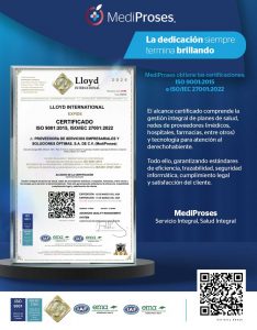 Hoy, esa forma de trabajar recibe un respaldo formal: MediProses ha obtenido las certificaciones ISO 9001:2015 e ISO/IEC 27001:2022, emitidas por Lloyd International. Este logro acredita nuestros sistemas de gestión de calidad y de seguridad de la información, y respalda nuestro lema: Servicio Integral, Salud Integral, en nuestro entorno de redes de proveedores y tecnología para atención al derechohabiente.